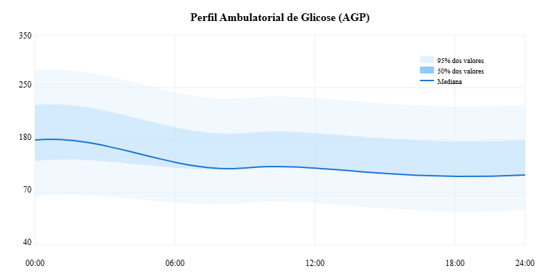 Figura 2: Exemplo de Perfil Ambulatorial de Glicose (AGP). O gráfico mostra como os dados de vários dias são combinados em uma única visualização de 24 horas. A linha central (mediana) representa o padrão típico de glicose, enquanto as faixas sombreadas mostram a variabilidade dos valores ao longo do período analisado. As faixas mais escuras indicam onde se encontram 50% das leituras, e as mais claras, 95% das leituras.